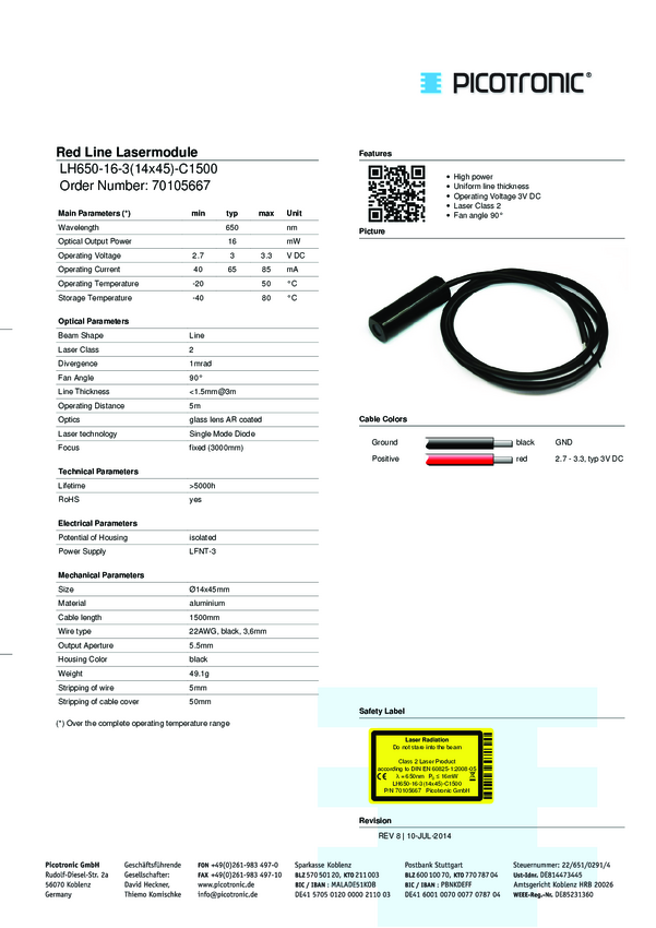 Picotronic Moduł laserowy liniowe czerwony 16 mW LH650-16-3 (14x45) -C1500