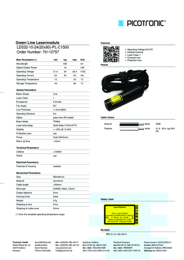 Picotronic 70112757 Moduł laserowy LD532-10-24(20x80)-PL-C1500, klasa 1, 10 mW, 532 nm