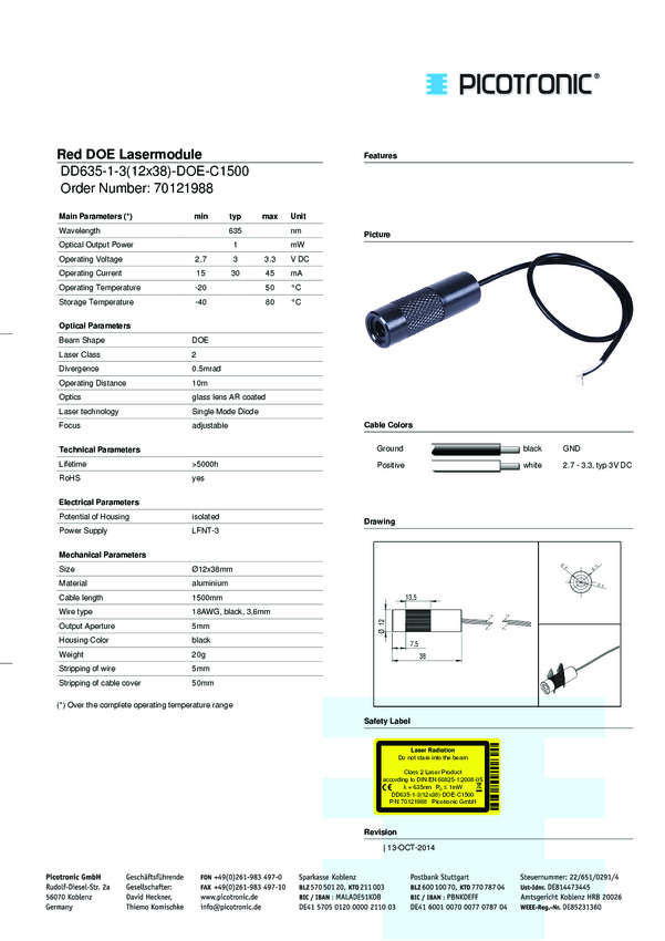 Picotronic 70121988 Moduł laserowy DD635-1-3(12x38)-DOE-C1500, klasa 2, 1 mW, 635 nm