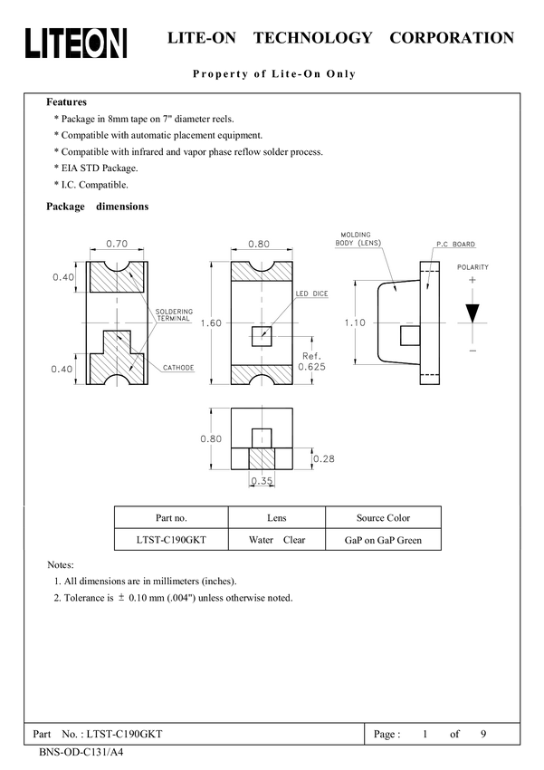 Lite-On LTST-C190KGKT Dioda LED SMD 1608 zielony 35 mcd 130 ° 20 mA 2 V