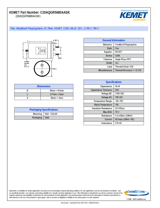 Cap Film 68uF 1100V PP 10% (85 X 247mm) Aluminum Cylindrical Can Screw 70°C Bulk