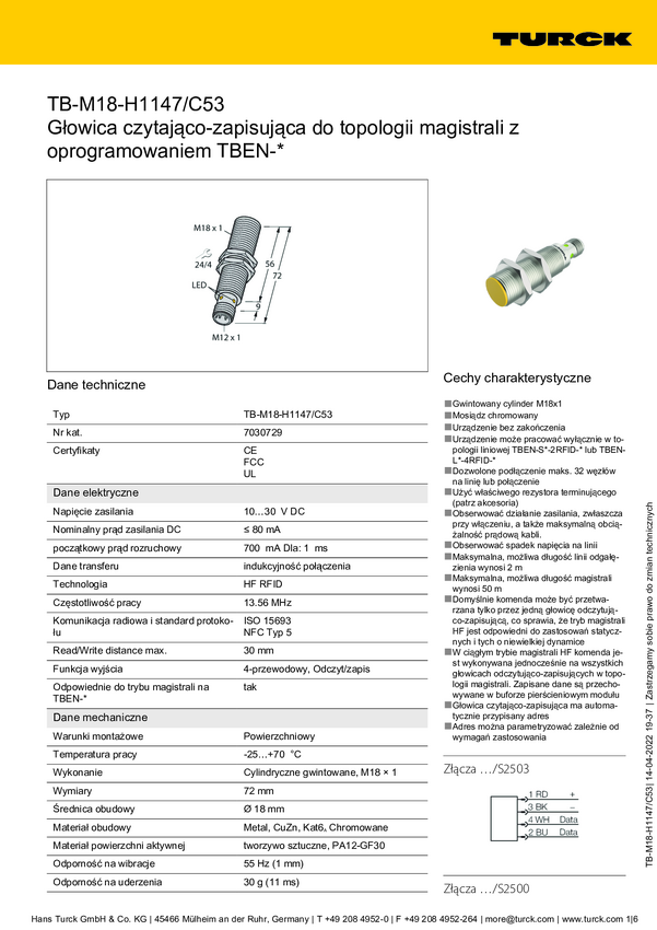 Głowica do odczytu i zapisu Turck TN-M18-H1147/C53 7030728, 1 szt.