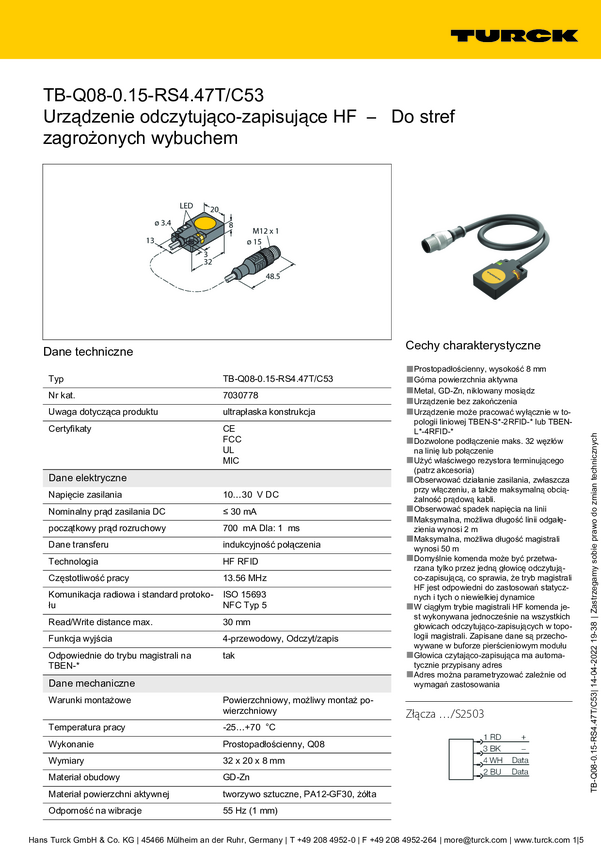 Turck TB-Q08-0.15-RS4.47T/C53 Głowica do odczytu i zapisu