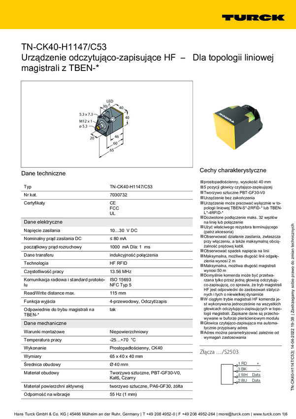 Turck TN-CK40-H1147/C53 Głowica do odczytu i zapisu