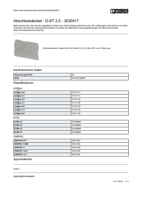 Phoenix Contact 3030417 Pokrywa zamykająca Kompatybilność: ST 1,5, ST 2,5, PT 2,5 szary 1 szt.