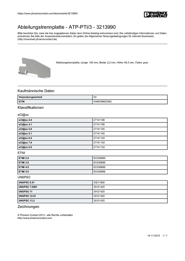 Phoenix Contact 3213990 Płyta rozdzielająca Kompatybilność: PTI 2,5-PE/L/NT, PTI 2,5-L/NT, PTI 2,5-L/LT, PTI 2,5-PE/L/L,