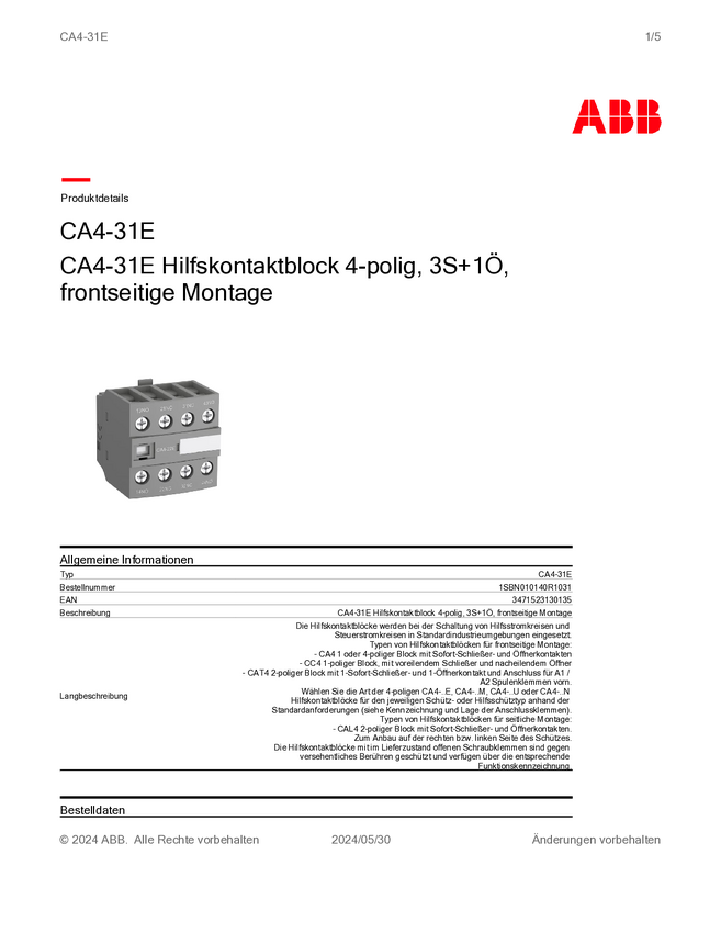 Przełącznik pomocniczy ABB CA4-31E 3 NO, 1 NC 1 szt.