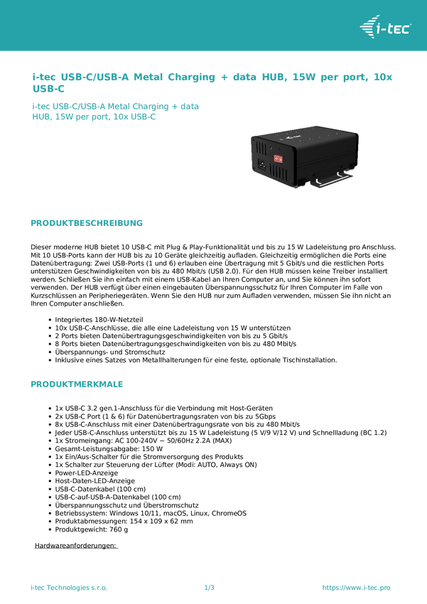 i-tec USB-C/USB-A Metal Ładowanie + HUB danych, 15W na port, 10x USB-C