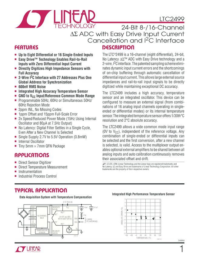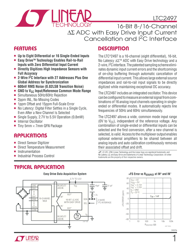 24-Bit 8-/16-Channel Delta Sigma ADC with Easy Drive Input Current Cancellation and I2C Interface