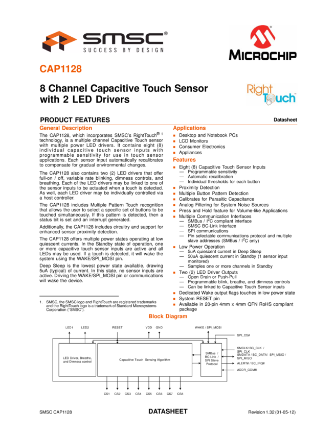 CAP1128 8 Channel Capacitive Touch Sensor with 2 LED Drivers Data Sheet (01/05/2012)