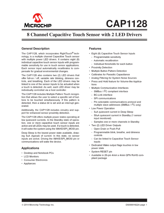 CAP1128 8 Channel Capacitive Touch Sensor with 2 LED Drivers Data Sheet (01/13/2014)
