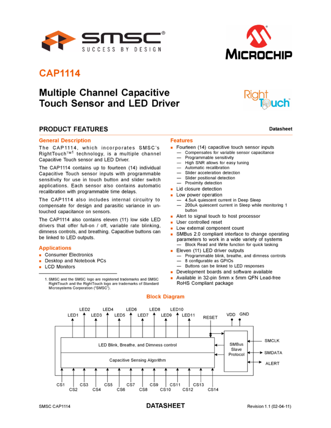 CAP1114 Multiple Channel Capacitive Touch Sensor and LED Driver Data Sheet (04/06/2010)