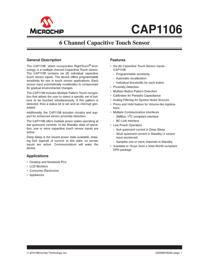 CAP1106 6 Channel Capacitive Touch Sensor Data Sheet (01/13/2014)