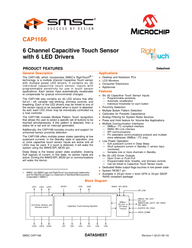 CAP1166 6 Channel Capacitive Touch Sensor with 6 LED Drivers Data Sheet (01/05/2012)