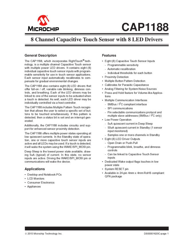 CAP1188 8 Channel Capacitive Touch Sensor with 8 LED Drivers Data Sheet (02/25/2014)