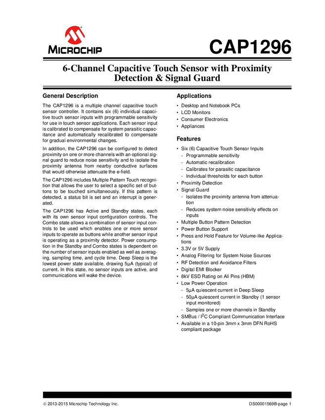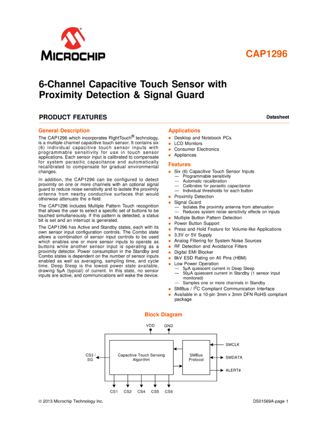 CAP1296 - 6-Channel Capacitive Touch Sensor w/Proximity Detection & Signal Guard (10/03/2013)