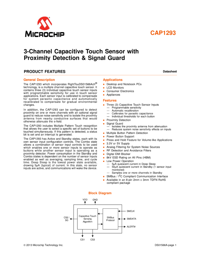 CAP1293 - 3-Channel Capacitive Touch Sensor w/Proximity Detection & Signal Guard (10/03/2013)