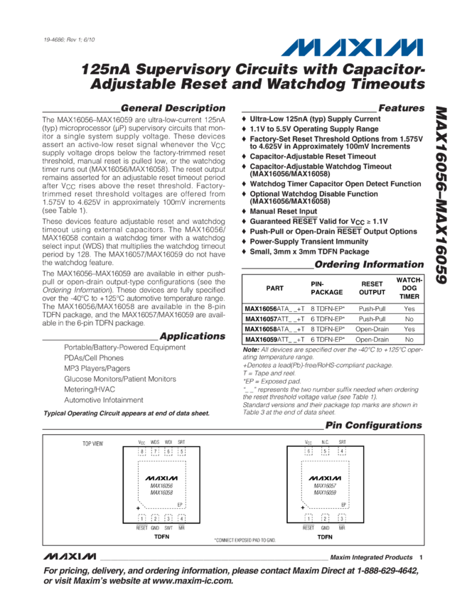 MAX16056, MAX16057, MAX16058, MAX16059 125nA Supervisory Circuits with Capacitor-Adjustable Reset and Watchdog Timeouts