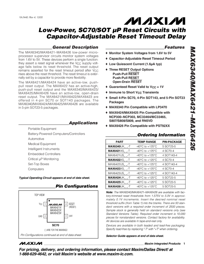MAX6340, MAX6421, MAX6422, MAX6423, MAX6424, MAX6425, MAX6426 Low-Power, SC70/SOT µP Reset Circuits with Capacitor-Adjustable Reset Timeout Delay