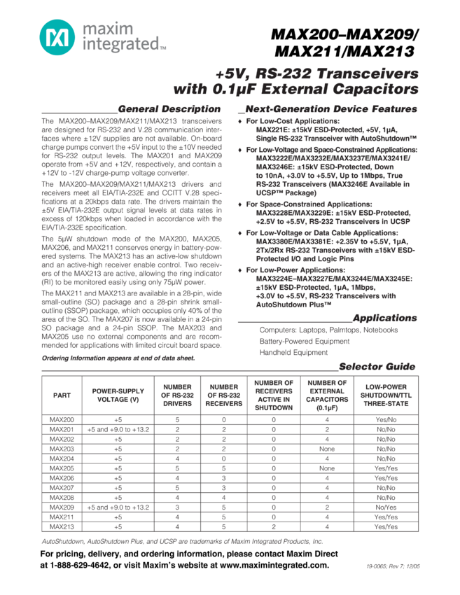 MAX200, MAX201, MAX202, MAX203, MAX204, MAX205, MAX206, MAX207, MAX208, MAX209, MAX211, MAX213 +5V, RS-232 Transceivers with 0.1µF External Capacitors