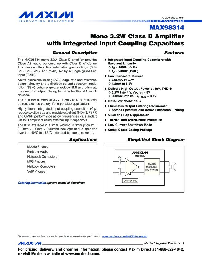 MAX98314 Mono 3.2W Class D Amplifier with Integrated Input Coupling Capacitors