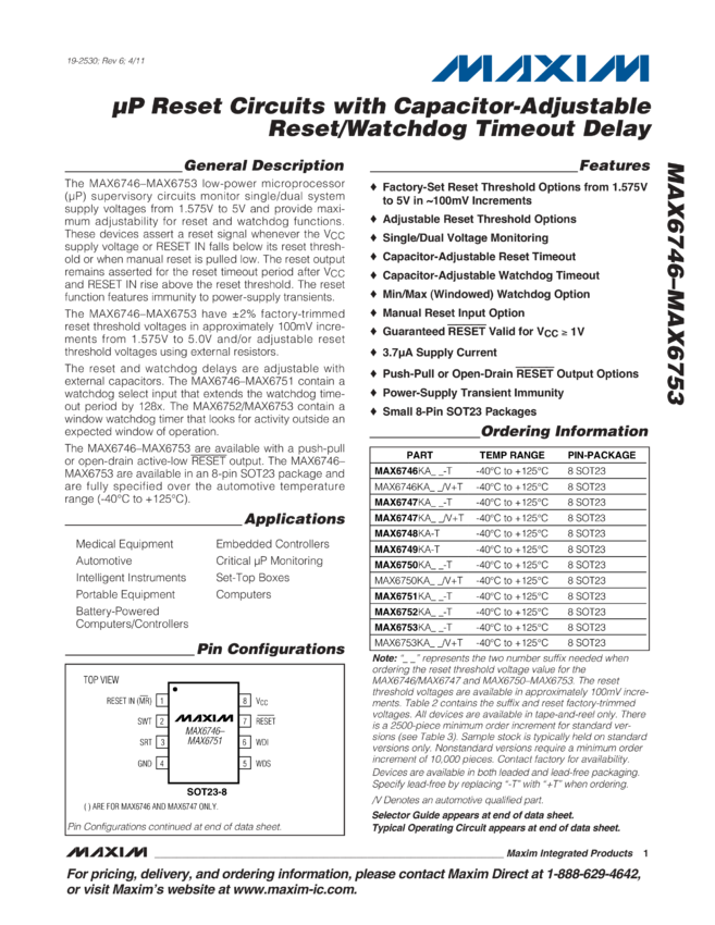 MAX6746, MAX6747, MAX6748, MAX6749, MAX6750, MAX6751, MAX6752, MAX6753 µP Reset Circuits with Capacitor-Adjustable Reset/Watchdog Timeout Delay