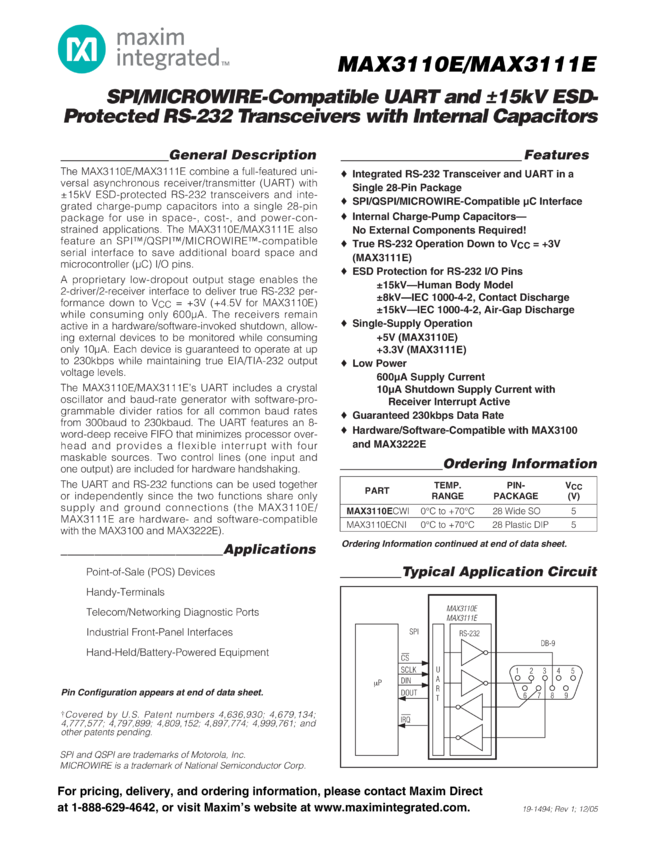 MAX3110E, MAX3111E SPI/MICROWIRE-Compatible UART and ±15kV ESD-Protected RS-232 Transceivers with Internal Capacitors