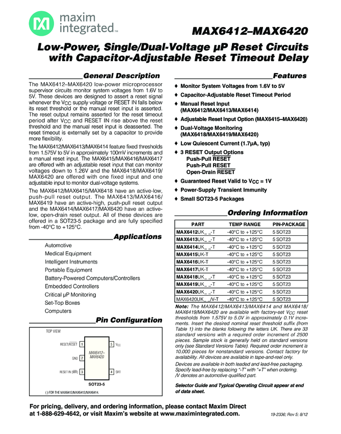MAX6412, MAX6413, MAX6414, MAX6415, MAX6416, MAX6417, MAX6418, MAX6419, MAX6420 Low-Power, Single/Dual-Voltage µP Reset Circuits with Capacitor-Adjustable Reset Timeout Delay