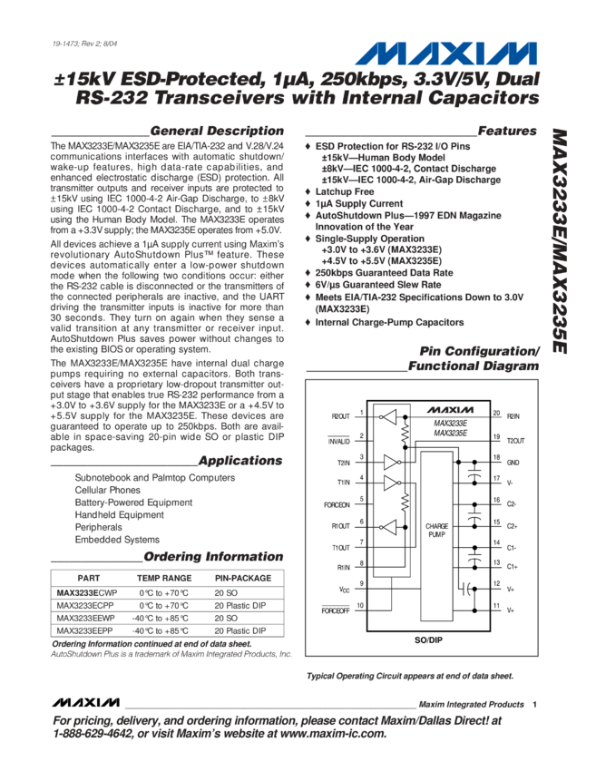 MAX3233E, MAX3235E ±15kV ESD-Protected, 1µA, 250kbps, 3.3V/5V, Dual RS-232 Transceivers with Internal Capacitors
