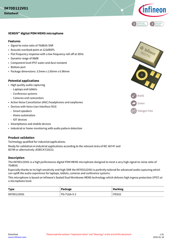 Ultra-low noise high sensitivity digital XENSIV™ MEMS microphone Infineon's ultra-low noise digital XENSIV™ MEMS microphone, IM73D122, features high SNR and sensitivity for high-quality audio capturing in laptops, tablets, and conferencing devices. Based on Infineon's Sealed Dual Membrane (SDM) MEMS technology, it delivers high IP57 ingress protection. Perfect for voice user interface applications.