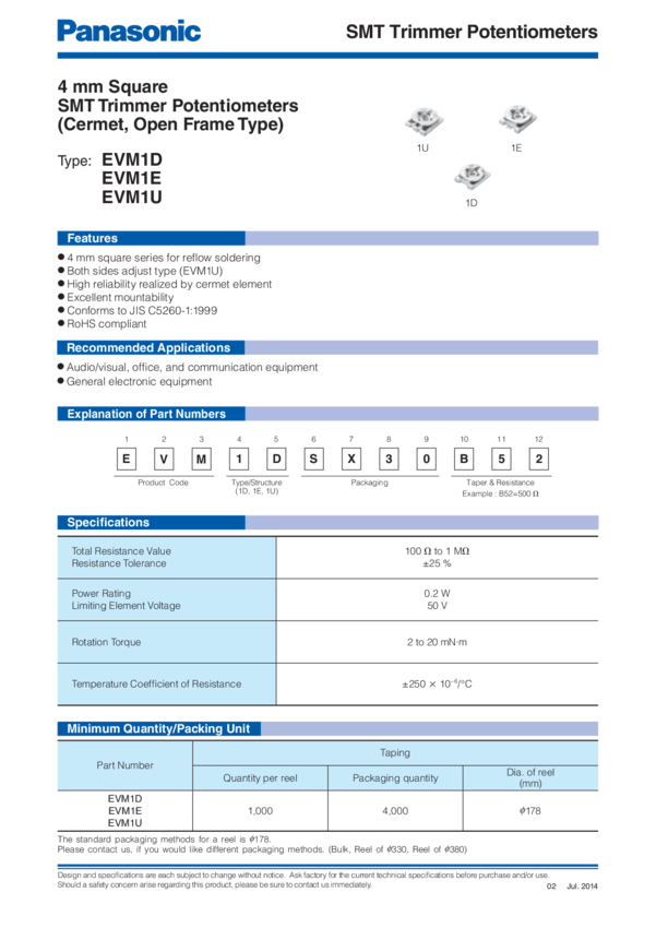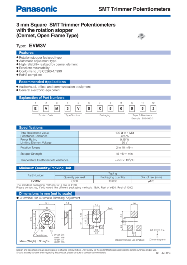 Res Cermet Trimmer 1K Ohm 25% 3/20W 1Turn (2.2 X 2.75 X 1.05mm) Foot Print SMD Carrier T/R