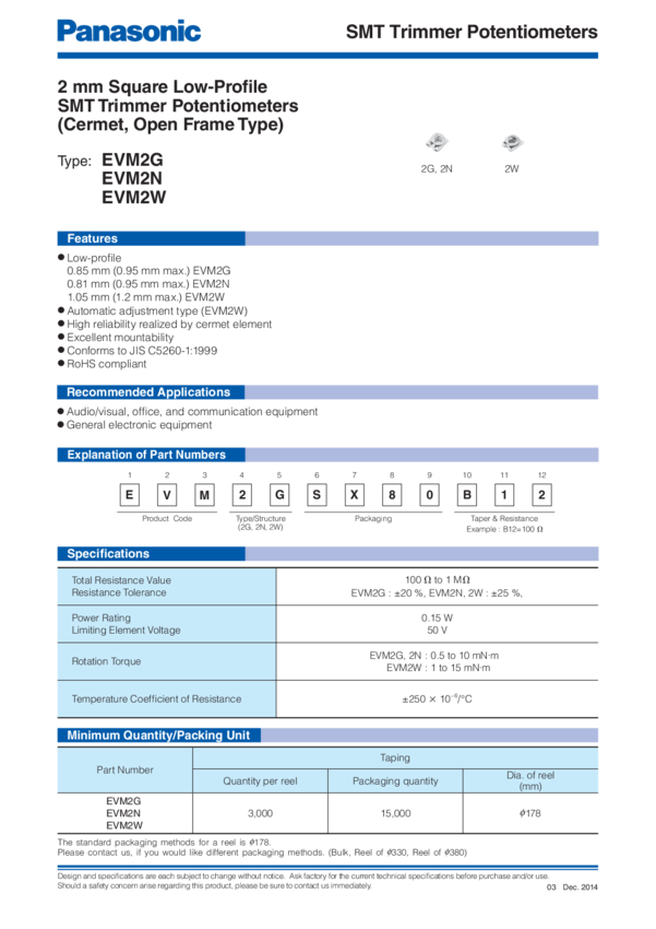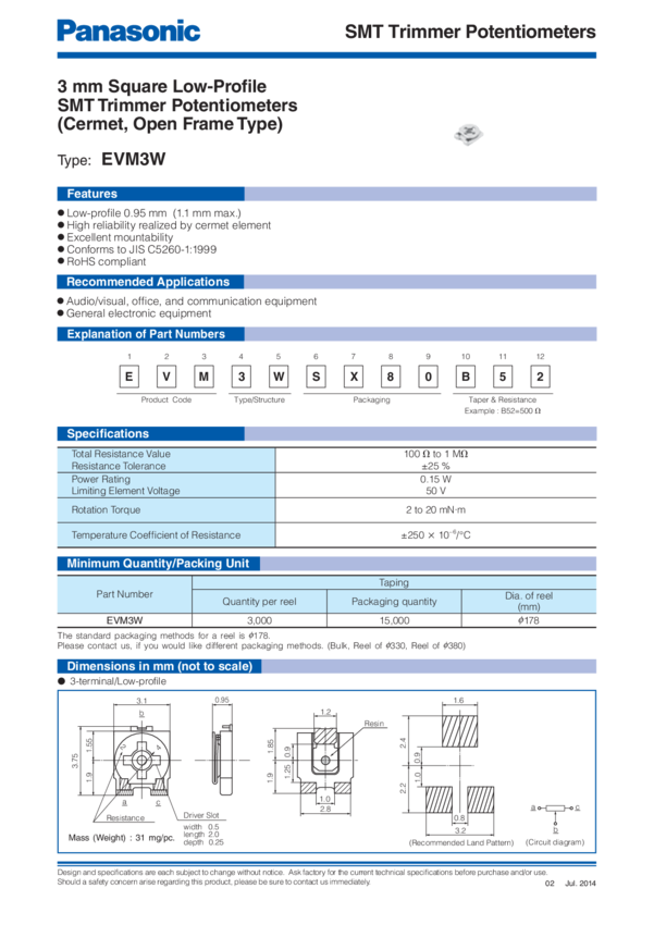 Res Cermet Trimmer 2K Ohm 25% 3/20W 1Turn (3.1 X 3.75 X 0.95mm) Foot Print SMD Carrier T/R