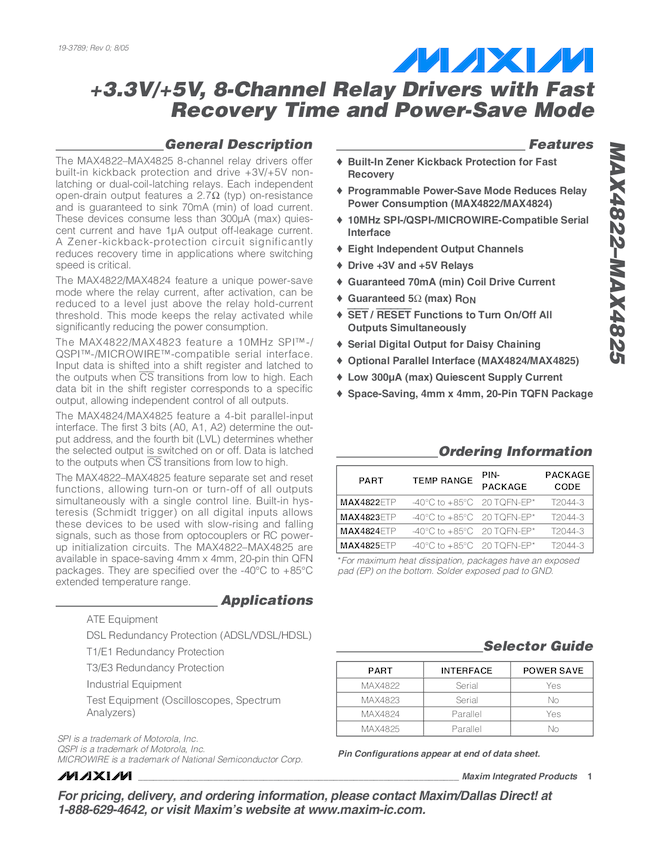 MAX4820, MAX4821 +3.3V/+5V, 8-Channel, Cascadable Relay Drivers with Serial/Parallel Interface