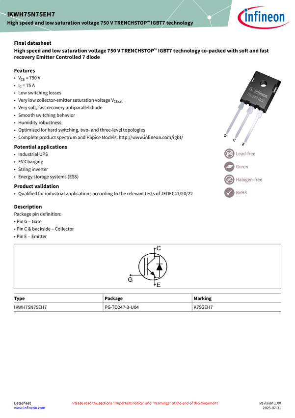 750 V TRENCHSTOP™ IGBT7 H7 Hard-switching 750 V, 75 A TRENCHSTOP™ IGBT7 H7 discrete in TO-247-3 High Creepage Clearance (HCC) package is an evolution of the 650 V version, designed to cater to the demands of green and efficient energy applications that require a higher voltage handling capability.