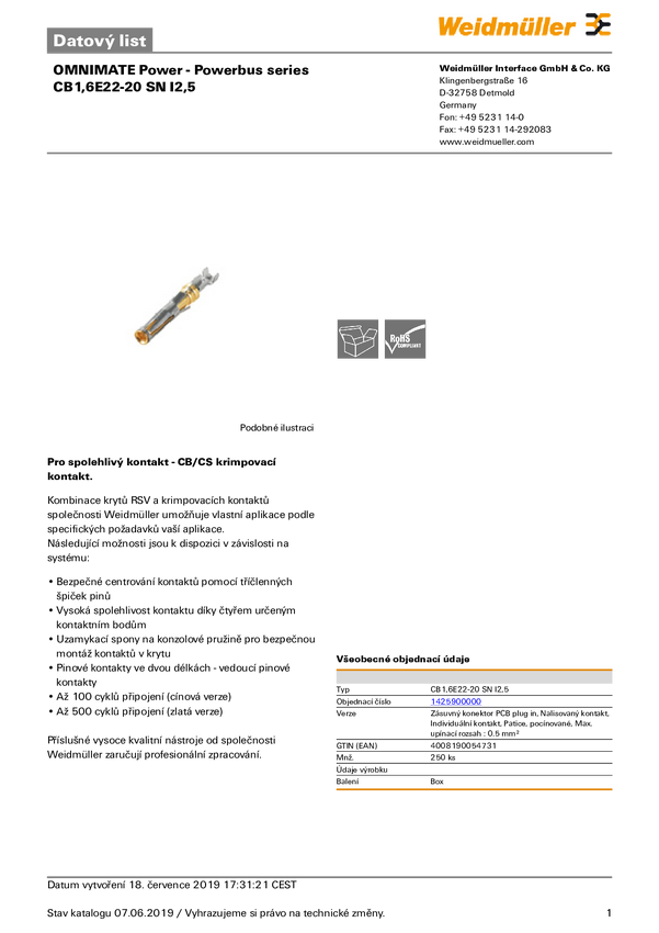 Weidmüller 1425800000 Styk zaciskany CB1,6R22-20 SN I2,5, wire-to-board, piny: 1, 5000 szt.