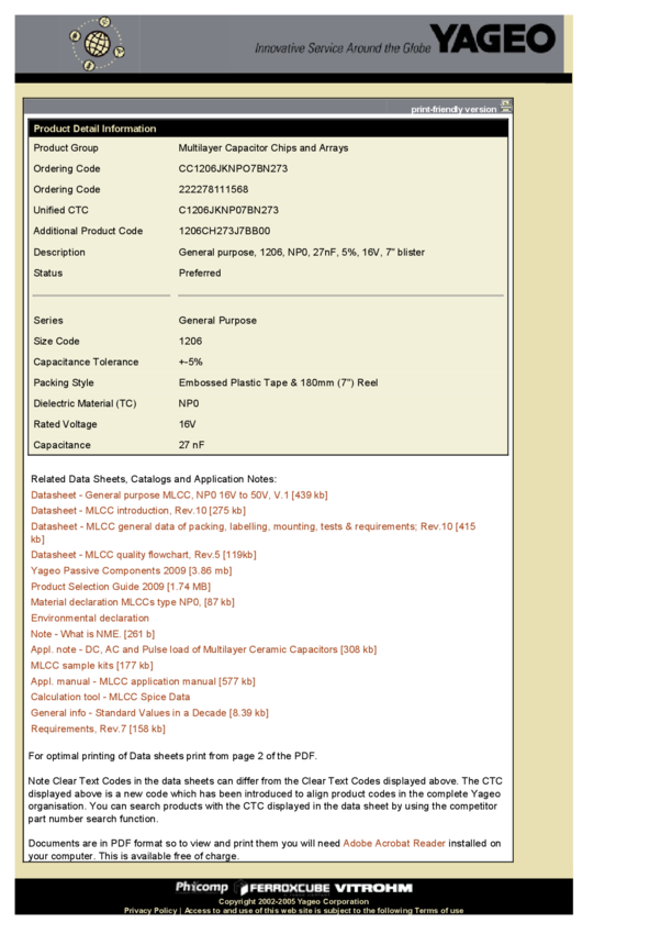 Cap Ceramic 0.027uF 16V C0G 5% SMD 1206 125°C Blister T/R