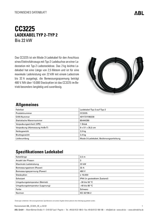 Kabel do ładowania samochodów elektrycznych ABL Sursum CC3225 2.5 m