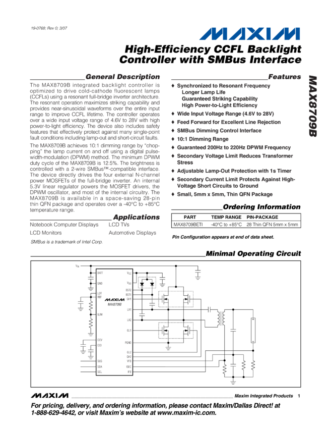 MAX8709B High-Efficiency CCFL Backlight Controller with SMBus Interface