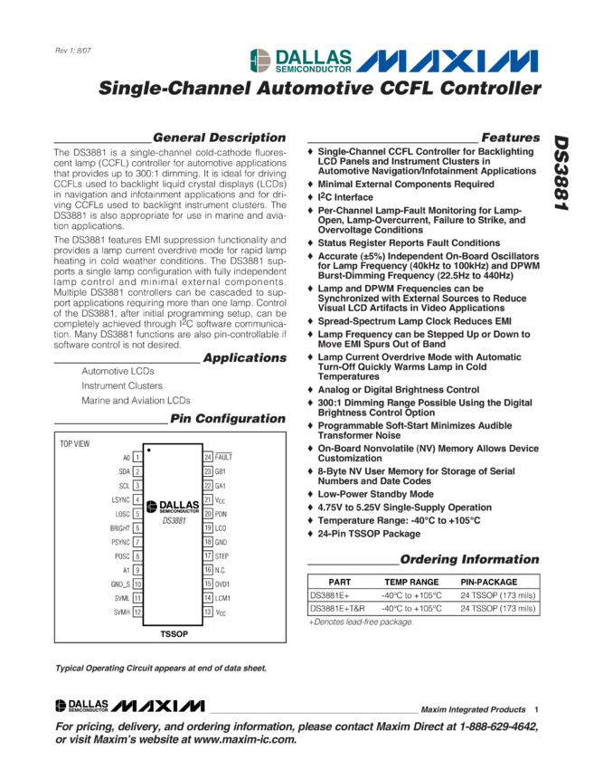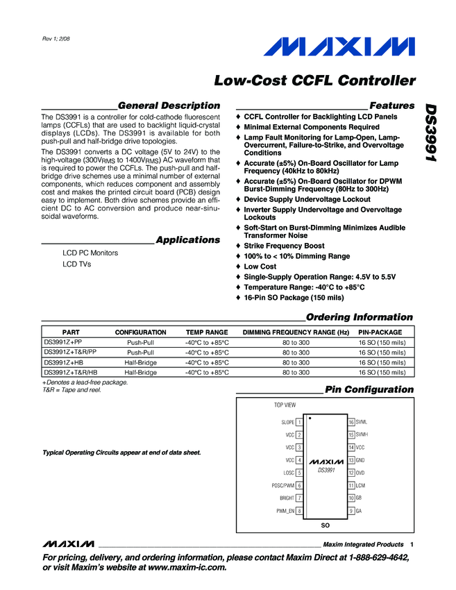 DS3992 Two-Channel, Push-Pull CCFL Controller