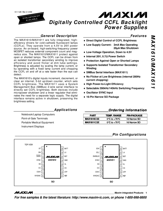 MAX1610, MAX1611 Digitally Controlled CCFL Backlight Power Supplies
