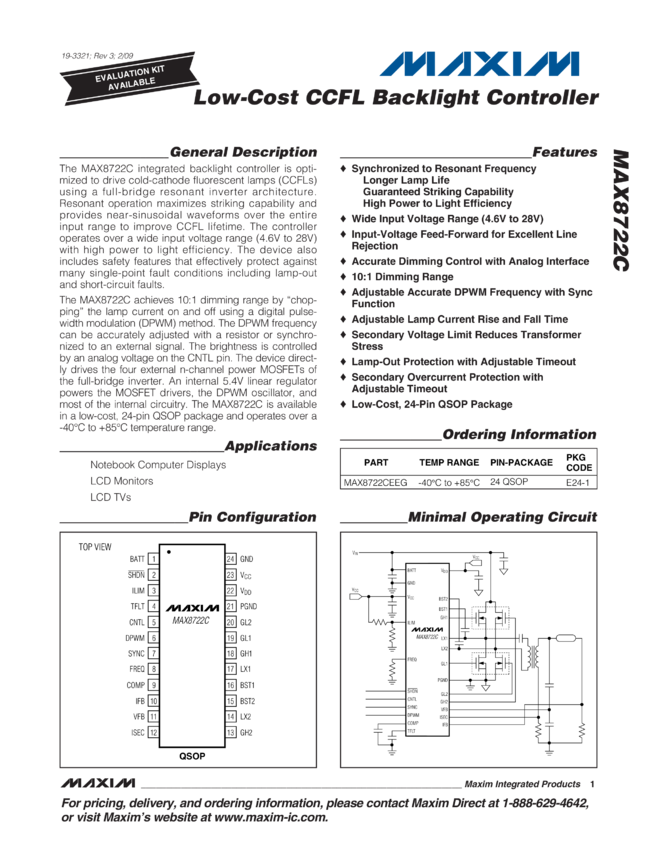 MAX1895, MAX1995 High-Efficiency, Wide Brightness Range, CCFL Backlight Controllers