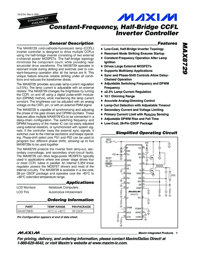 MAX8729 Constant-Frequency, Half-Bridge CCFL Inverter Controller
