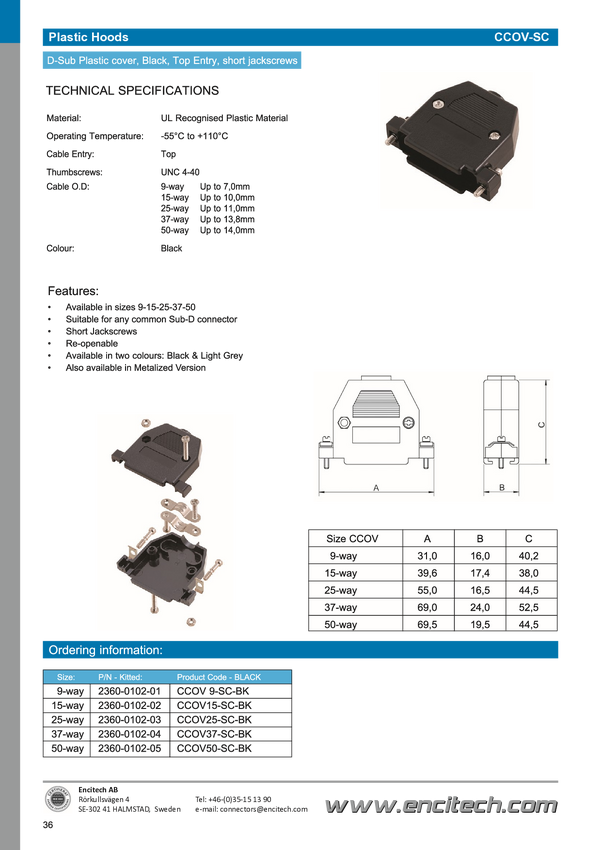 encitech 2360-0102-05 Obudowa złącza D-SUB CCOV 50-SC-BK, tworzywo sztuczne, 180 °, 1 szt.