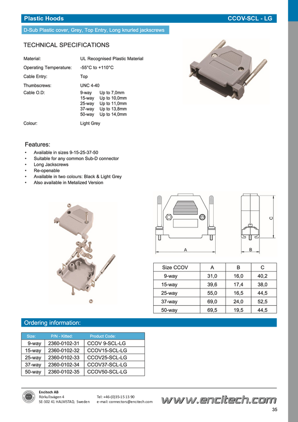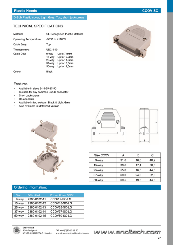 encitech 2360-0102-31 Obudowa złącza D-SUB CCOV09-SCL-LG, tworzywo sztuczne, 180 °, 1 szt.
