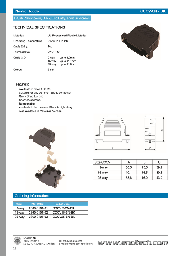 encitech CCOV09-SN-BK 2360-0101-01 Obudowa złącza D-SUB Ilość styków: 9 tworzywo sztuczne 180 ° czarny 1 szt.