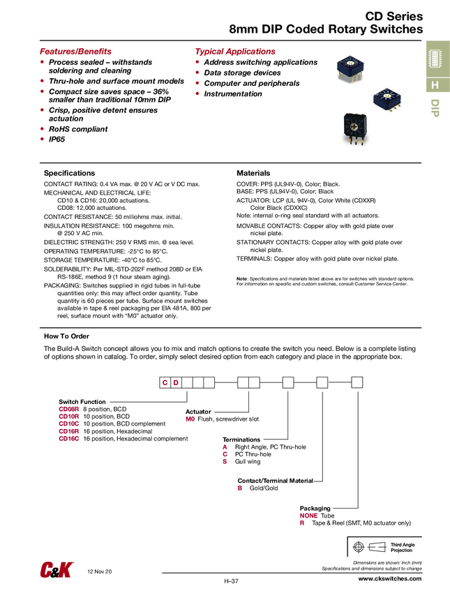 Switch DIP SP16T 16 Flush Screwdriver 20VAC 20VDC 0.4VA Gull Wing 20000Cycle 2.54mm SMD Tube