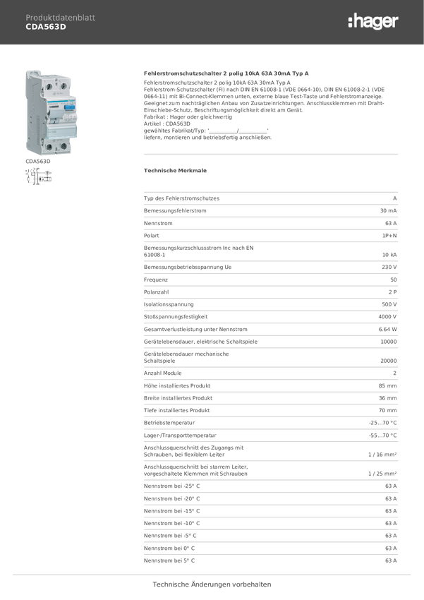 Hager CDA563D Wyłącznik różnicowoprądowy A 2 styki 63 A 0.03 A 230 V
