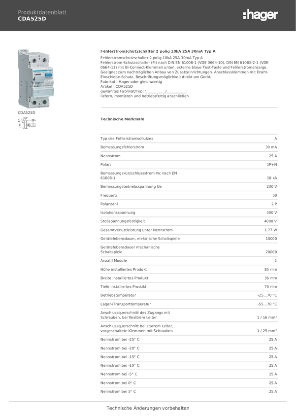 Wyłącznik różnicowoprądowy Hager CDA525D, 2 styki, 25 A, 0.03 A, 230 V