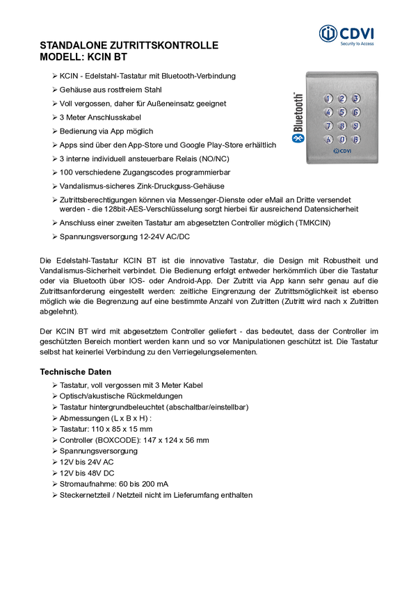 Zamek kodowy CDVI Security F0201000053-G 12 V, 24 V, 48 V IP65 współpraca z bluetooth, z podświetlaną klawiaturą