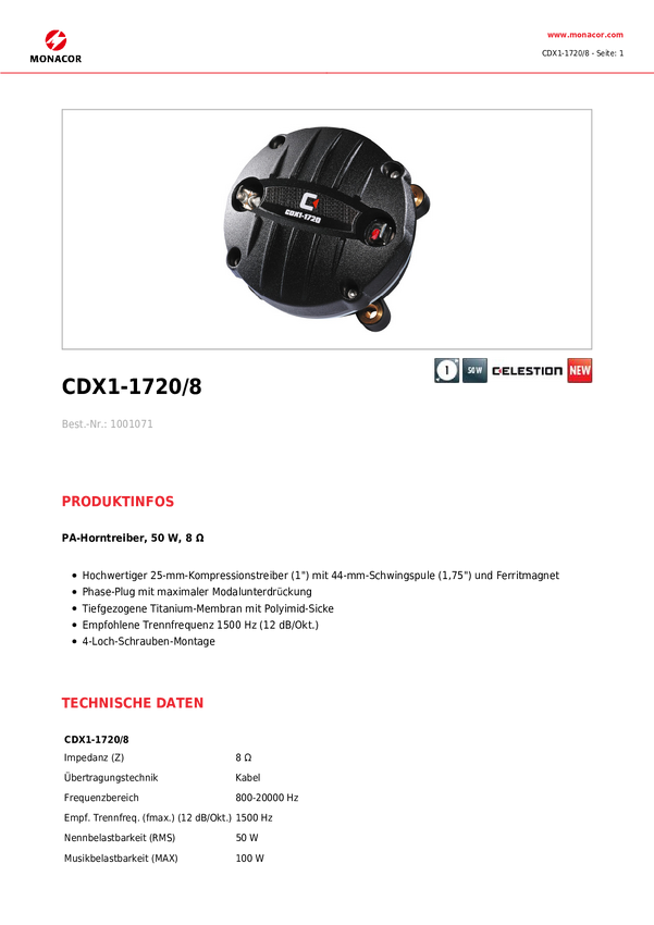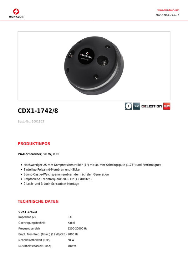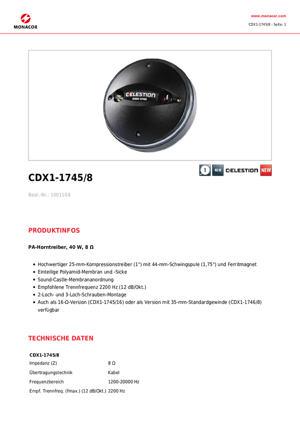 Celestion CDX1-1747/8 Sterownik tubowy PA Moc RMS=60 W 8 Ω